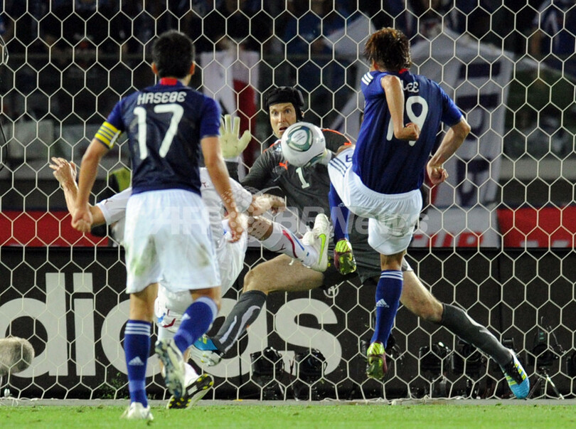 写真は、李忠成(Tadanari Lee、右)のシュートをセーブするチェコのGKペトル・チェフ(Petr Cech、中央、2011年6月7日撮影)。(c)AFP/TOSHIFUMI KITAMURA