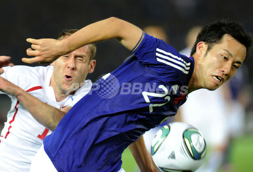 写真は、チェコのミハル・フブニク(Michal Hubnik、左)とボールを競る吉田麻也(Maya Yoshida、2011年6月7日撮影)。(c)AFP/TOSHIFUMI KITAMURA