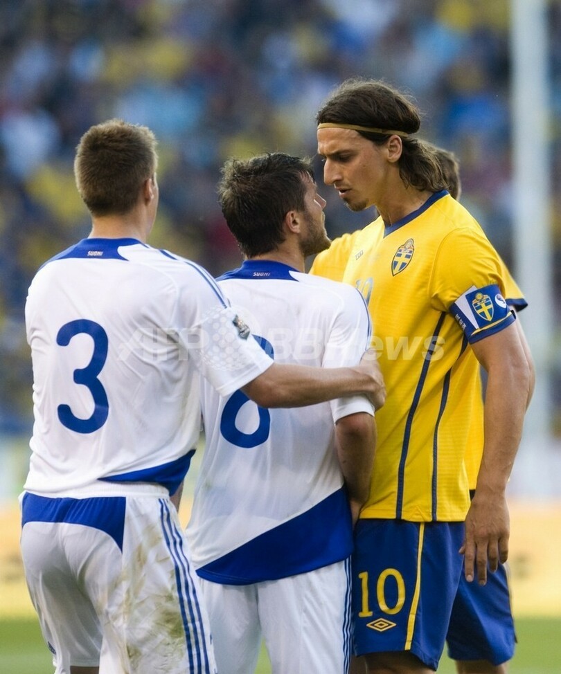 また同日行われたグループEの試合では、スウェーデンがズラタン・イブラヒモビッチ(Zlatan Ibrahimovic)のハットトリックなどでフィンランドを5-0と圧倒した。イブラヒモビッチは前半31分、35分に立て続けに得点を奪うと、後半8分にハットトリックを達成した。(c)AFP