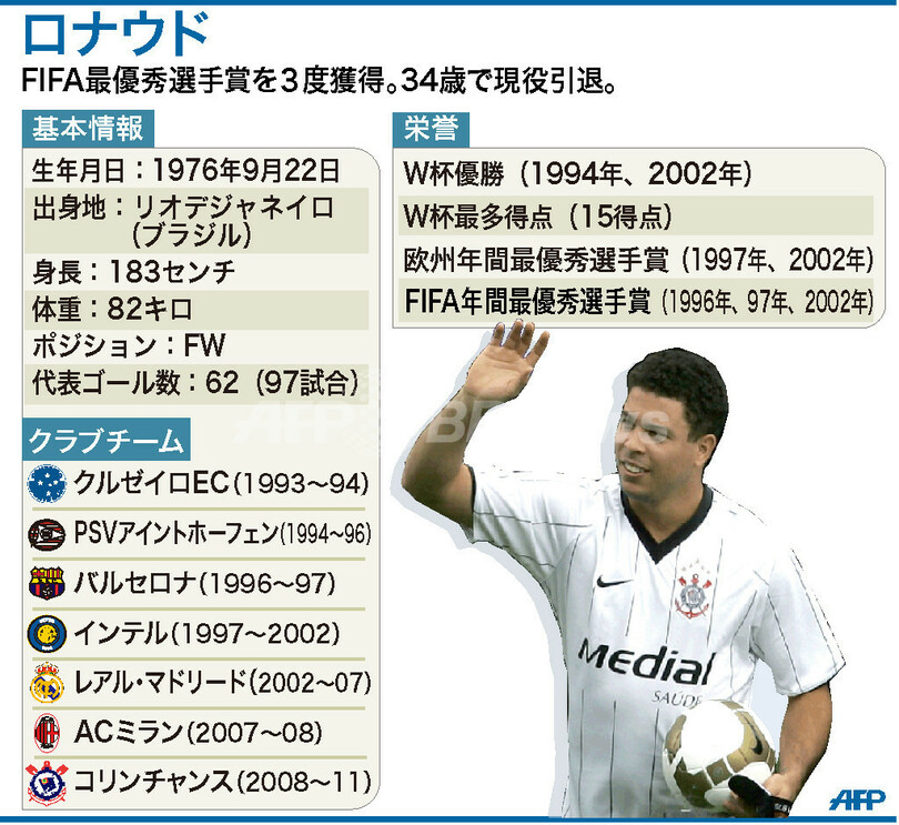 スポーツ サッカー 図解 【図解】サッカー元ブラジル代表のロナウド 2011年6月9日 16:03 発信地:ブラジル [ 中南米 ブラジル ] このニュースをシェア (c)AFP 【6月9日 AFP】図は、サッカー元ブラジル代表のロナウド(Ronaldo)について示したもの。(c)AFP<ニュース解説画像一覧へ> サッカー 一覧へ> メディア・報道関係・法人の方向け 写真・動画 購入のお問合せ>