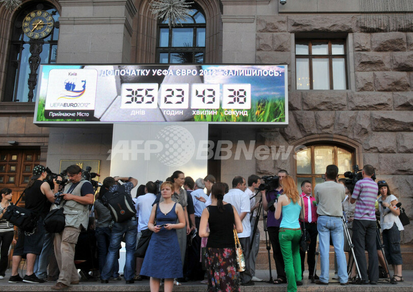 【6月11日 AFP】ウクライナの首都キエフ(Kiev)で8日、女性活動団体「FEMEN」の活動家が、サッカー欧州選手権2012(UEFA Euro 2012)本大会開幕まであと1年のカウントダウンイベント会場で、「売春のないEURO 2012を」とボディペインティングをして抗議行動を行った。欧州選手権2012はウクライナとポーランドの共催で、本大会は2012年6月8日に開幕する。(c)AFP