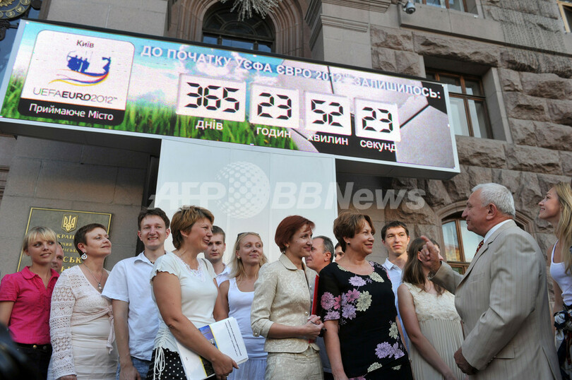 【6月11日 AFP】ウクライナの首都キエフ(Kiev)で8日、女性活動団体「FEMEN」の活動家が、サッカー欧州選手権2012(UEFA Euro 2012)本大会開幕まであと1年のカウントダウンイベント会場で、「売春のないEURO 2012を」とボディペインティングをして抗議行動を行った。欧州選手権2012はウクライナとポーランドの共催で、本大会は2012年6月8日に開幕する。(c)AFP