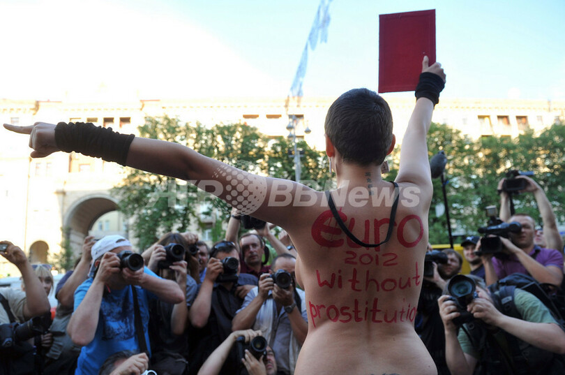 【6月11日 AFP】ウクライナの首都キエフ(Kiev)で8日、女性活動団体「FEMEN」の活動家が、サッカー欧州選手権2012(UEFA Euro 2012)本大会開幕まであと1年のカウントダウンイベント会場で、「売春のないEURO 2012を」とボディペインティングをして抗議行動を行った。欧州選手権2012はウクライナとポーランドの共催で、本大会は2012年6月8日に開幕する。(c)AFP