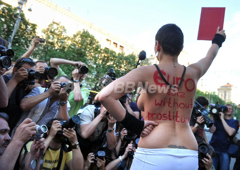 【6月11日 AFP】ウクライナの首都キエフ(Kiev)で8日、女性活動団体「FEMEN」の活動家が、サッカー欧州選手権2012(UEFA Euro 2012)本大会開幕まであと1年のカウントダウンイベント会場で、「売春のないEURO 2012を」とボディペインティングをして抗議行動を行った。欧州選手権2012はウクライナとポーランドの共催で、本大会は2012年6月8日に開幕する。(c)AFP