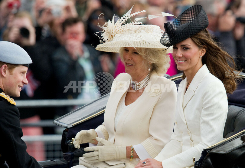 写真はパレードに加わるヘンリー王子(Prince Harry)、カミラ夫人(Camilla、Duchess of Cornwall)、キャサリン妃(Catherine, Duchess of Cambridge、2011年6月11日撮影)。(c)AFP/Leon Neal
