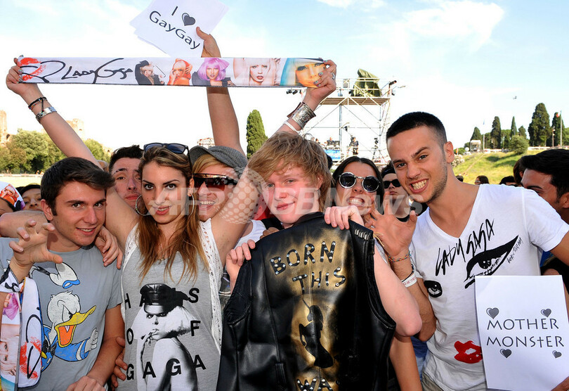 同性愛を認めない立場のローマ教会やシルビオ・ベルルスコーニ(Silvio Berlusconi)首相に対抗して、同性愛者のメッセージを世界に広めるため、今年は米国で活躍する歌手のレディー・ガガ(Lady Gaga)がゲストに招かれ、会場でパフォーマンスを披露した。(c)AFP