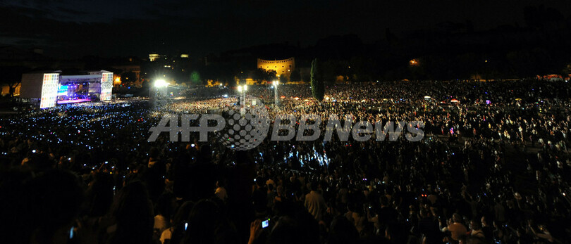 同性愛を認めない立場のローマ教会やシルビオ・ベルルスコーニ(Silvio Berlusconi)首相に対抗して、同性愛者のメッセージを世界に広めるため、今年は米国で活躍する歌手のレディー・ガガ(Lady Gaga)がゲストに招かれ、会場でパフォーマンスを披露した。(c)AFP