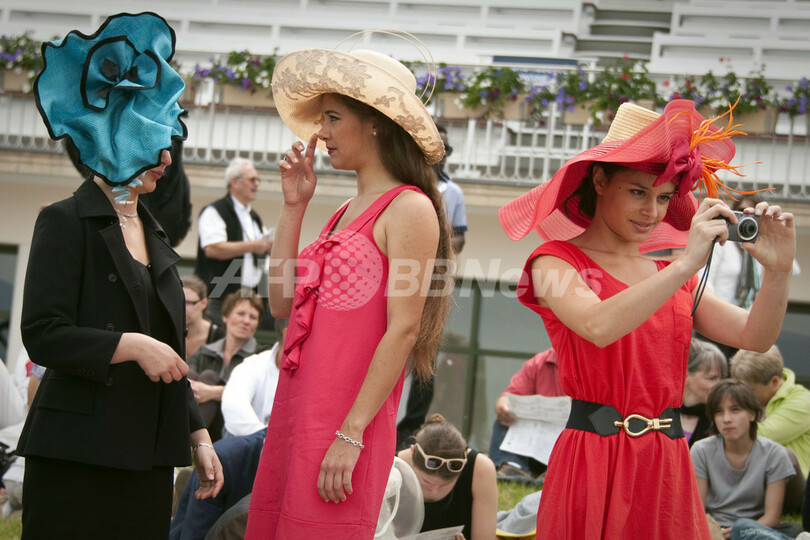 フランス・パリ郊外のシャンティー(Chantilly)で12日、競馬の第162回ディアヌ賞(Prix de Diane 2011)が開催された。会場では、女性たちのユニークな帽子がひときわ目立っていた(2011年6月12日撮影)。(c)AFP/LIONEL BONAVENTURE
