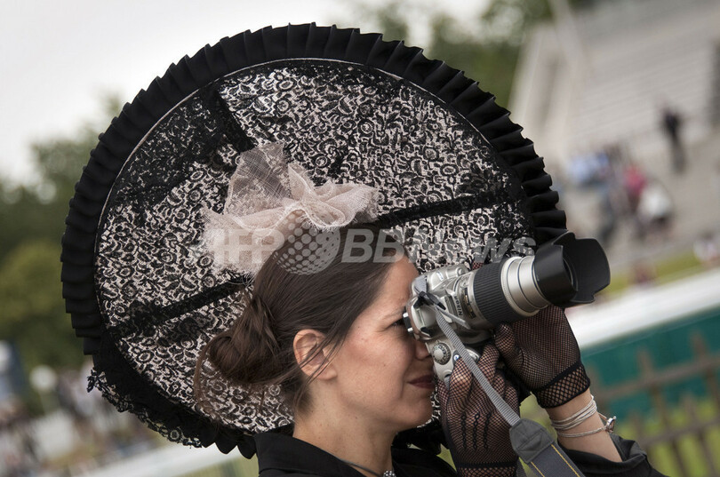 フランス・パリ郊外のシャンティー(Chantilly)で12日、競馬の第162回ディアヌ賞(Prix de Diane 2011)が開催された。会場では、女性たちのユニークな帽子がひときわ目立っていた(2011年6月12日撮影)。(c)AFP/LIONEL BONAVENTURE