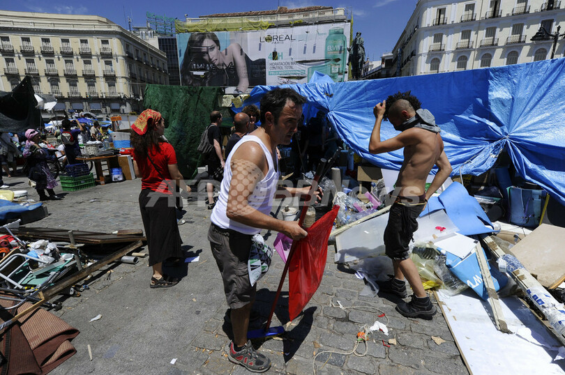 【6月13日 AFP】スペインの失業率の高さと経済危機に抗議し、首都マドリード(Madrid)のプエルタ・デル・ソル(Puerta del Sol)広場で5月15日から約1か月にわたって座り込みを続けていた若者らを中心とするデモ隊が12日、撤収を開始した。