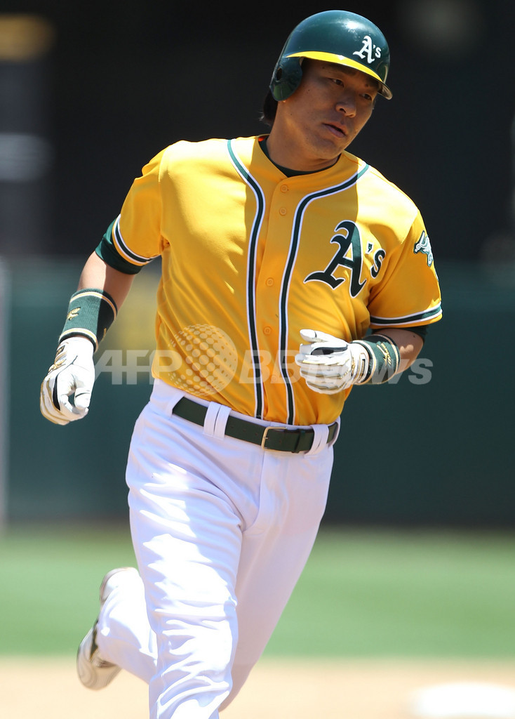 3番指名打者で先発出場したアスレチックスの松井秀喜(Hideki Matsui)は、3回裏に6号ソロ本塁打を放ち、4打数1安打1打点だった。(c)AFP