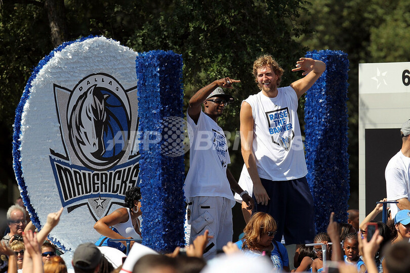 パレードでは、ファイナルのMVP(最優秀選手賞)に選出されたダーク・ノビツキー(Dirk Nowitzki)にこの日一番の声援が送られた。ノビツキーは「山あり谷ありだったけど、頂点まで上りつめた。本当に最高の気分」と語った。(c)AFP/Linda Jones