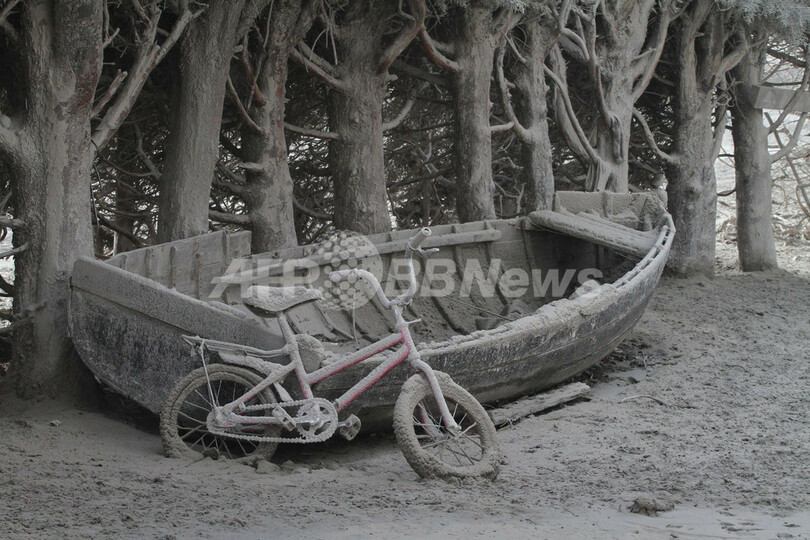 写真はアルゼンチン・リオネグロ(Rio Negro)州Villa Llanquin村で、火山灰が積もったままのボートと自転車(2011年6月17日撮影)。(c)AFP/FRANCISCO RAMOS MEJIA