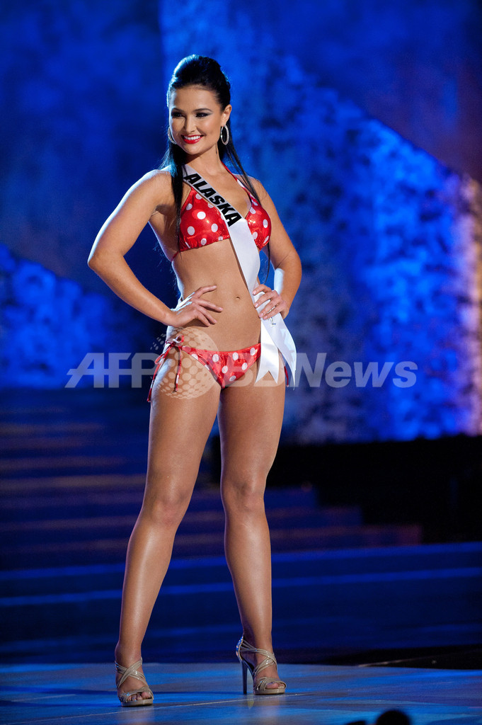 19日に開催されるミスUSAを前に、米ネバダ(Nevada)州ラスベガス(Las Vegas)のプラネット・ハリウッド・リゾート・アンド・カジノ(Planet Hollywood Resort & Casino)で全米各州から集まった出場者たちが水着姿を披露した。ミスUSAの模様は米NBCテレビで生中継される。写真はミス・アラスカのジェシカ・チャックラン(Jessica Chuckran)さん(2011年6月15日撮影)。(c)AFP/MISS UNIVERSE ORGANIZATION