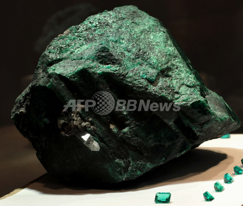 この原石を所有するコロンビアの鉱業会社Coexminasは、世界最大のエメラルド原石だとしている。コロンビアは世界のエメラルドの55%を産出し、1年間の輸出額は2億ドル (約160億円)に上る(2011年6月18日撮影)。(c)AFP