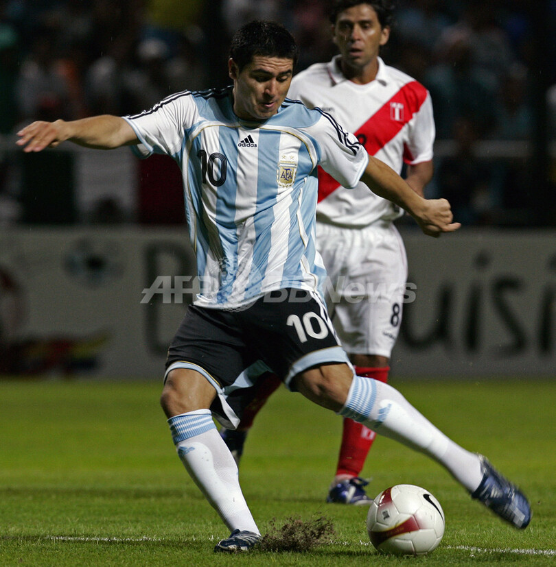 コパ・アメリカ2007(Copa America 2007)ベネズエラ大会。準々決勝のペルー戦で得点を決めるアルゼンチンのファン・ロマン・リケルメ(Juan Roman Riquelme、2007年7月8日撮影)。(c)AFP/ALEJANDRO PAGNI