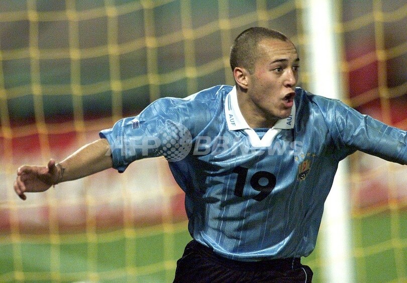 コパ・アメリカ2001(Copa America 2001)コロンビア大会。グループリーグのボリビア戦でゴールを決め喜ぶウルグアイのエルネスト・ハビエル・チェバントン(Ernesto Javier Chevanton、2001年7月13日撮影)。(c)AFP/Fabian GREDILLAS
