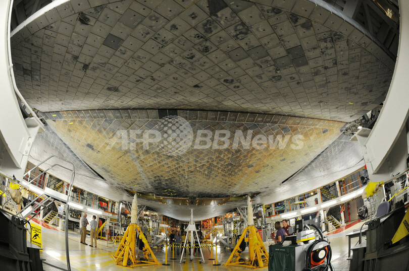 写真はシャトル先端部の胴体に付いたフラップ(2011年6月21日撮影)。(c)AFP/Bruce Weaver