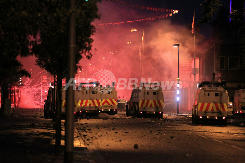 【6月23日 AFP】北アイルランド・ベルファスト(Belfast)東部で20日、プロテスタント勢力とカトリック勢力の大規模な衝突が起きた。暴徒化した人々は警官隊とも衝突を繰り返し、21日には取材中のカメラマンが銃撃され負傷。3日目の22日夜は武装警察が展開し大きな衝突はなかったが、にらみ合った200人ほどが石や瓶などを投げ合うなど、ここ数年で最悪の宗派間抗争が続いている。