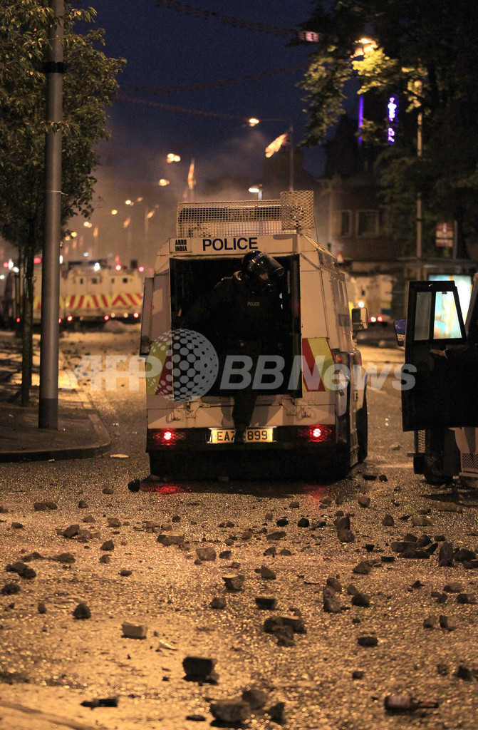 【6月23日 AFP】北アイルランド・ベルファスト(Belfast)東部で20日、プロテスタント勢力とカトリック勢力の大規模な衝突が起きた。暴徒化した人々は警官隊とも衝突を繰り返し、21日には取材中のカメラマンが銃撃され負傷。3日目の22日夜は武装警察が展開し大きな衝突はなかったが、にらみ合った200人ほどが石や瓶などを投げ合うなど、ここ数年で最悪の宗派間抗争が続いている。