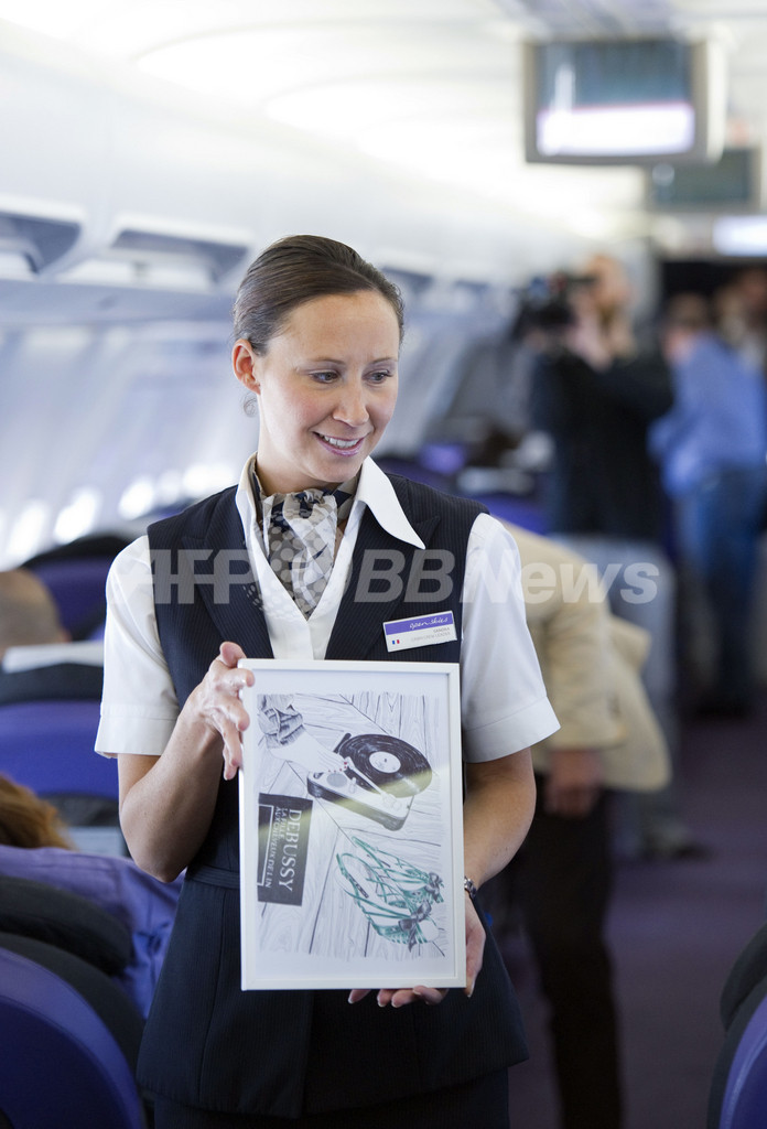 【6月23日 AFP】英航空大手ブリティッシュ・エアウェイズ(British Airways、BA)傘下の高級航空会社オープンスカイズ(Open Skies)のパリ~ニューヨーク路線で22日、上空9000メートルを飛行中の機内で美術品オークションが開催された。このようなオークションは世界初。仏Dexter Galleryとオープンスカイズ航空が共同で企画したもので、売り上げは全て仏キュリー研究所(Institut Curie)に寄付される。(c)AFP