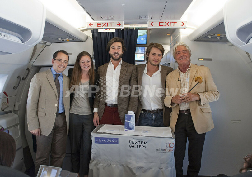 【6月23日 AFP】英航空大手ブリティッシュ・エアウェイズ(British Airways、BA)傘下の高級航空会社オープンスカイズ(Open Skies)のパリ~ニューヨーク路線で22日、上空9000メートルを飛行中の機内で美術品オークションが開催された。このようなオークションは世界初。仏Dexter Galleryとオープンスカイズ航空が共同で企画したもので、売り上げは全て仏キュリー研究所(Institut Curie)に寄付される。(c)AFP