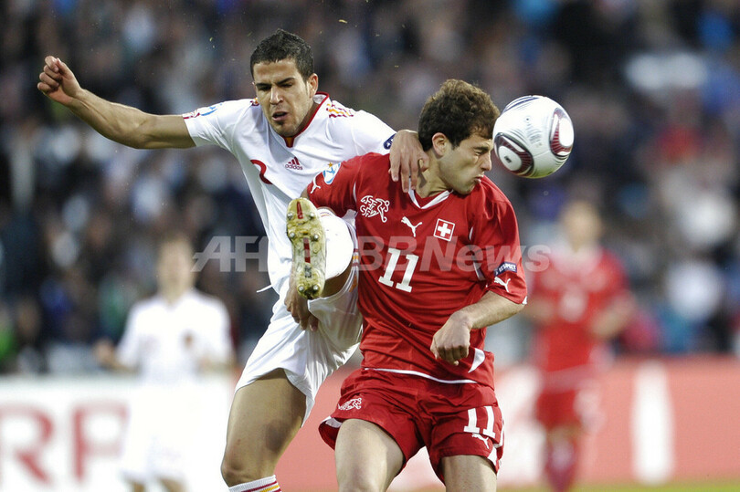 U-21欧州選手権2011(UEFA European Under-21 Championship 2011)決勝、スイス対スペイン。スイスのアドミル・メフメディ(Admir Mehmedi、右)とボールを競るスペインのアルバロ・ドミンゲス(Alvaro Dominguez、2011年6月25日撮影)。(c)AFP/SCANPIX/HENNING BAGGER