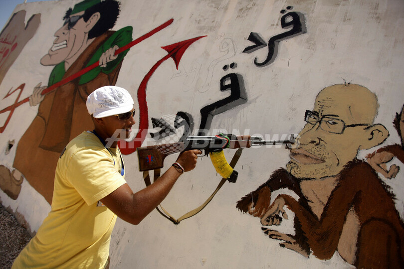 写真は反体制派が掌握するベンガジ(Benghazi)で、カダフィ大佐とその息子を描いた絵に向けて、銃口を構える反体制派の男性(2011年6月26日撮影)。(c)AFP/PATRICK BAZ