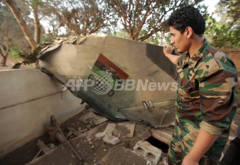 写真は反体制派が掌握するベンガジ(Benghazi)で、墜落した戦闘機の破片を眺める反体制派の男性(2011年6月26日撮影)。(c)AFP/PATRICK BAZ