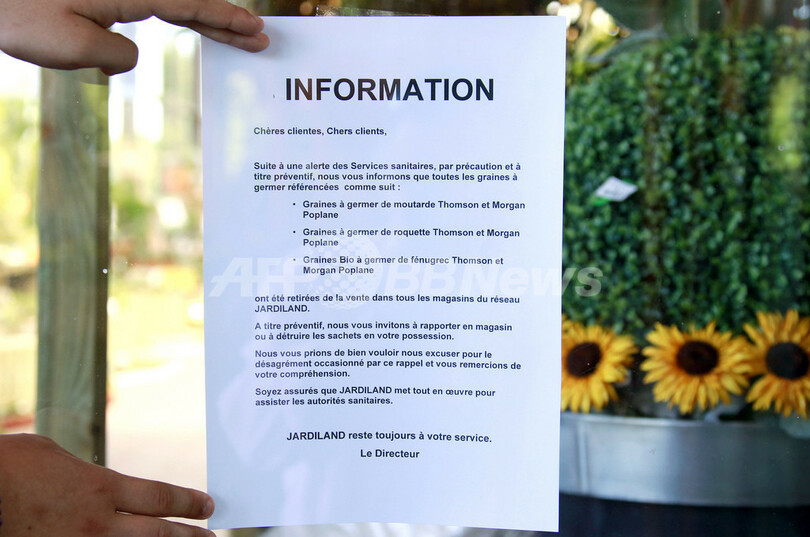 フレデリック・ルフェーブル(Frederic Lefebvre)消費者問題担当相は24日、英国の種苗業者トンプソン&モーガン(Thompson & Morgan)から輸入したスプラウトの種子との関連が疑われると発表。これを受け、英食品基準庁(FSA)は26日、アルファルファ、緑豆、フェヌグリーク(コロハ、インド料理の香辛料として用いられる)などのスプラウトを食べる際はよく火を入れ、生食は避けるよう英国民に呼びかけた。FSAによると、英国では食中毒は発生していないという。(c)AFP