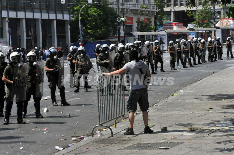 【6月29日 AFP】ギリシャで28日、政府の財政緊縮策に反対する主要労組がゼネスト入りする中、同じく政府の方針に抗議する1万人が首都アテネ(Athens)の国会議事堂前の広場でデモを行った。参加した一部の若者が火炎びんを投げ付けるなどして暴徒化し、警察の暴動鎮圧部隊が催涙ガスを発射する事態となった。