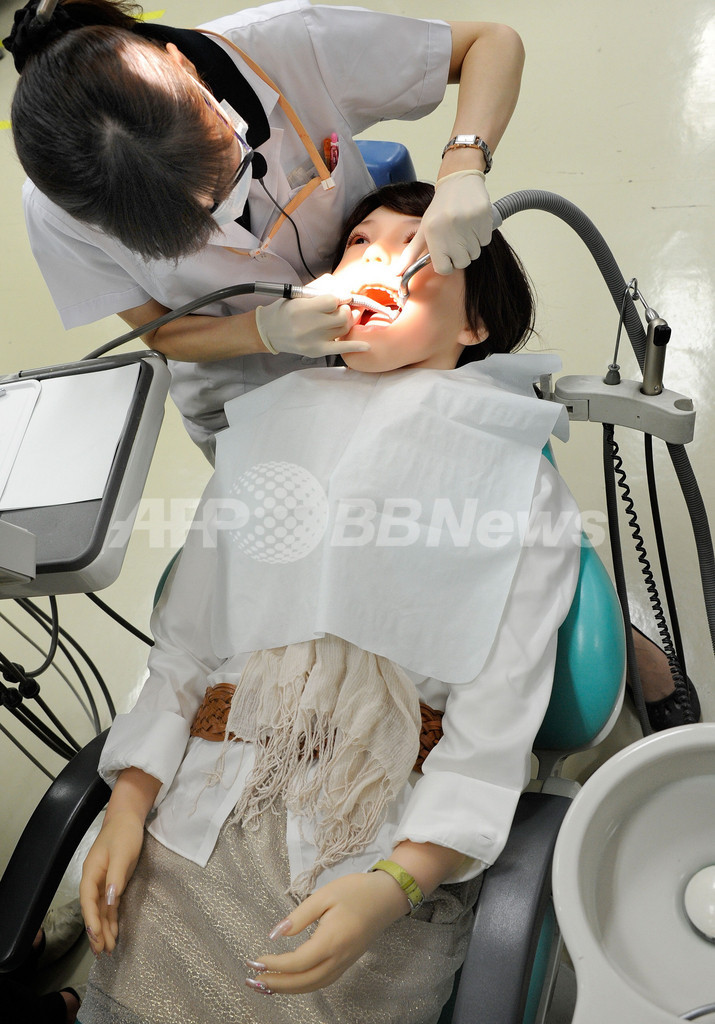 【6月30日 AFP】都内の昭和大学(Showa University)歯学部付属の昭和大学歯科病院で患者ロボットの改良版、「昭和花子2(Hanako Showa 2)」を使って治療のデモンストレーションをする歯科医。
