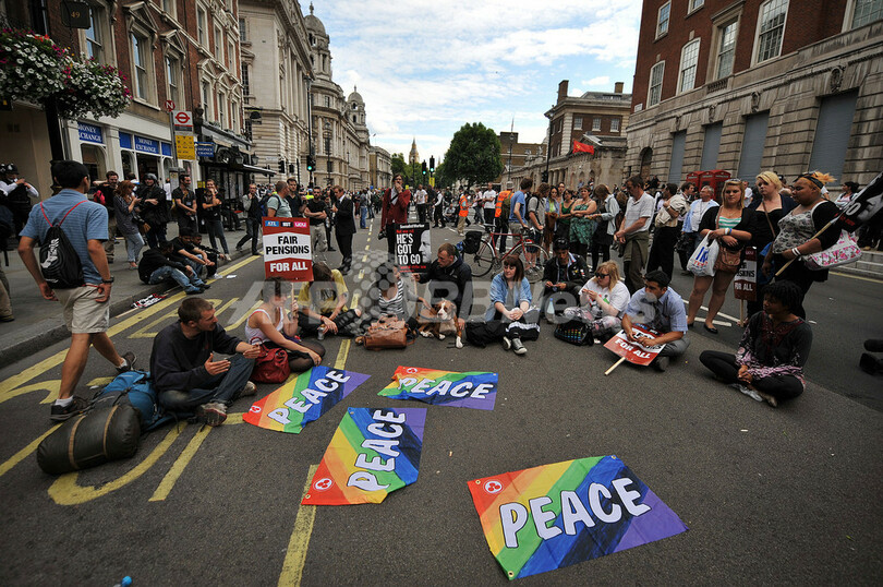 写真は、ロンドン中心部でのデモで路上に座り込む参加者ら(2011年6月30日撮影)。(c)AFP/BEN STANSALL