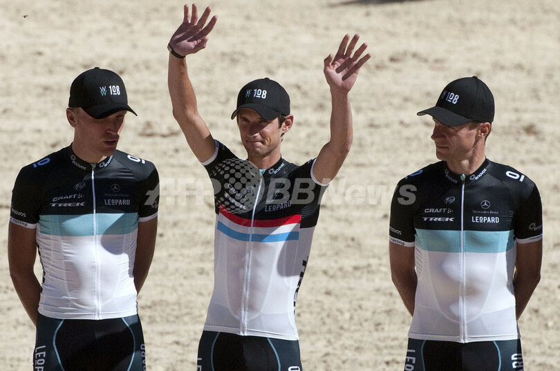 写真はチームプレゼンテーションに参加するレオパード・トレック(Leopard Trek)のフランク・シュレック(Frank Schleck、中央、2011年6月30日撮影)。(c)AFP/LIONEL BONAVENTURE