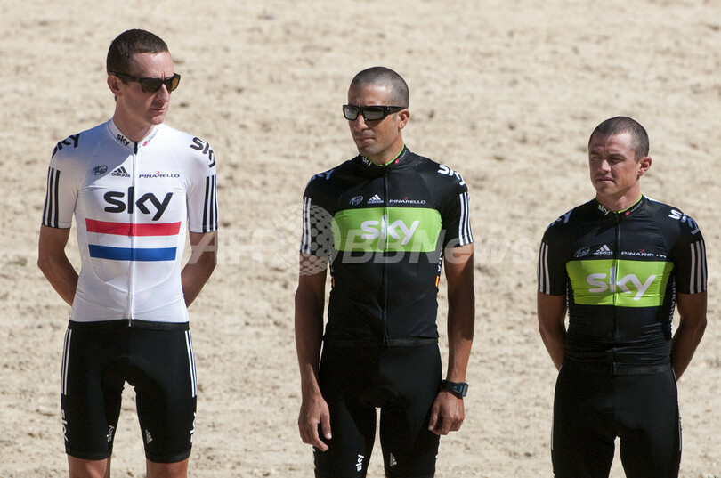 写真はチームプレゼンテーションに参加するチーム・スカイ(Team Sky)の(左から)ブラドレー・ウイギンズ(Bradley Wiggins)、ファン・アントニオ・フレチャ(Juan Antonio Flecha)、サイモン・ゲランス(Simon Gerrans、2011年6月30日撮影)。(c)AFP/LIONEL BONAVENTURE