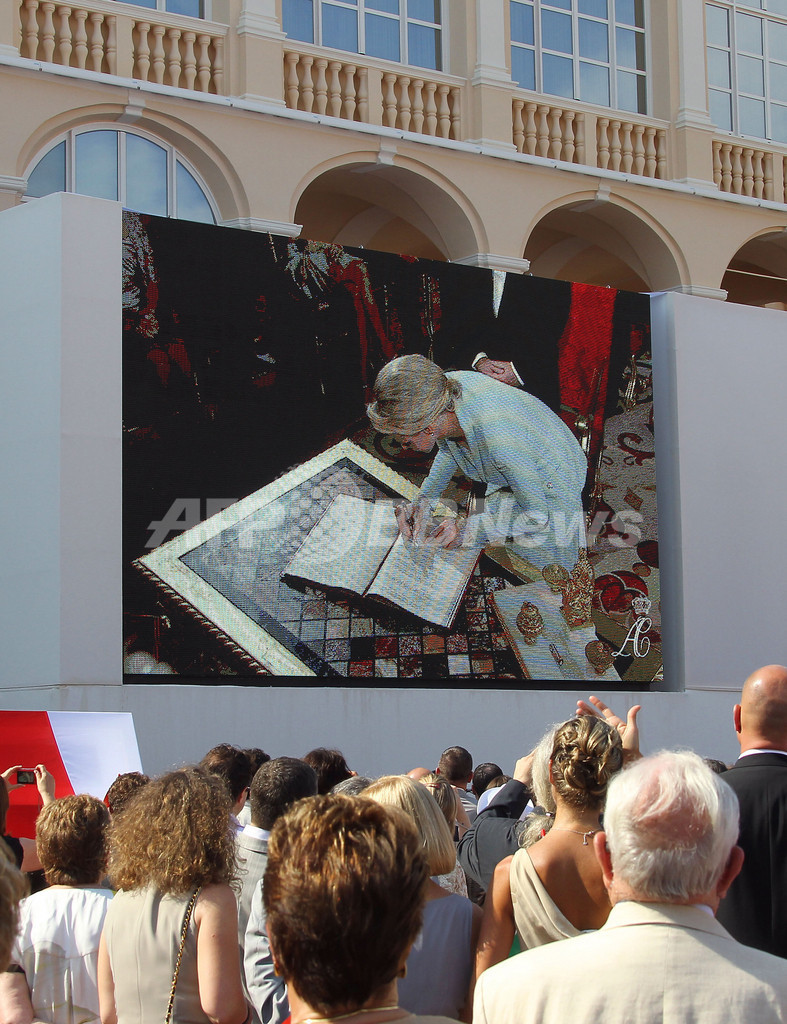 結婚式には、親族と友人など90人が出席。自分でデザインしたブルーのドレスを着て結婚式に臨んだウィットストックさんは、誓いの言葉で、アルベール公の手をとるか、と問われると、はっきりとした声で「Oui(はい)」と答えた。