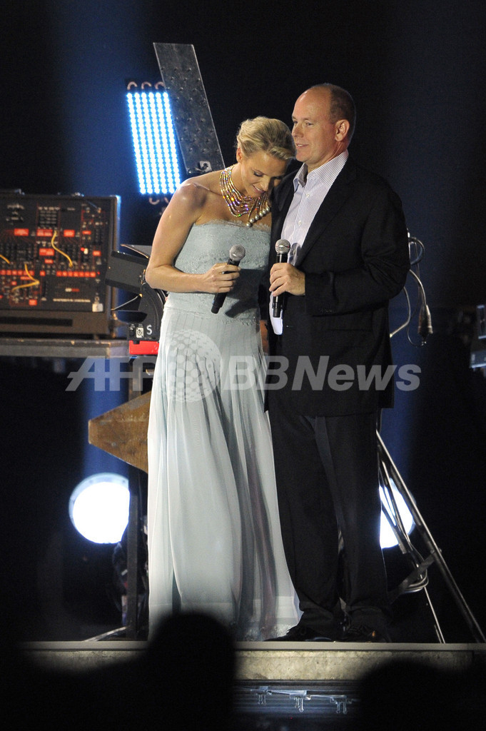 写真は、結婚式の夜、2人の結婚を祝う「音と光のショー」に出席するアルベール公とシャルレーヌ妃(2011年7月1日撮影)。(c)AFP/FRED DUFOUR