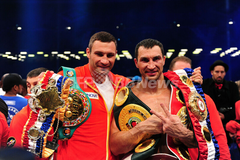 クリチコの兄のビタリ・クリチコ(Vitali Klitschko、ウクライナ)がWBCヘビー級王座を保持しているため、クリチコ兄弟が4団体の同級王者の座を独占することとなった。(c)AFP/Ryland James