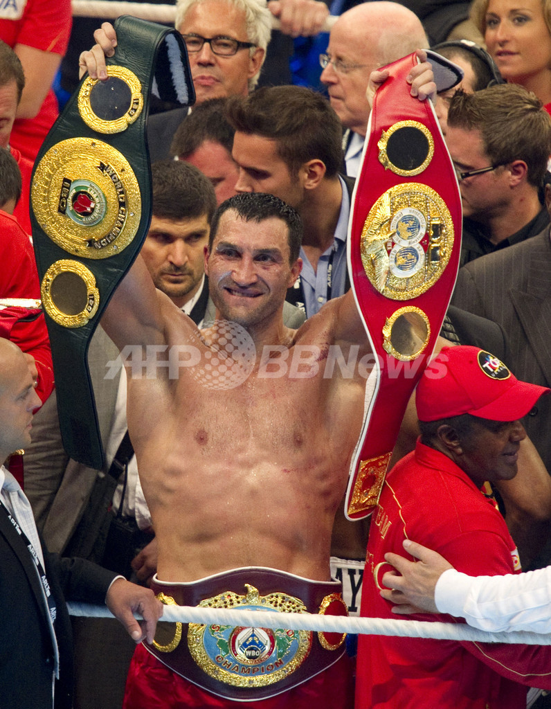 クリチコの兄のビタリ・クリチコ(Vitali Klitschko、ウクライナ)がWBCヘビー級王座を保持しているため、クリチコ兄弟が4団体の同級王者の座を独占することとなった。(c)AFP/Ryland James