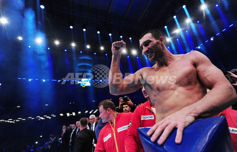 クリチコの兄のビタリ・クリチコ(Vitali Klitschko、ウクライナ)がWBCヘビー級王座を保持しているため、クリチコ兄弟が4団体の同級王者の座を独占することとなった。(c)AFP/Ryland James