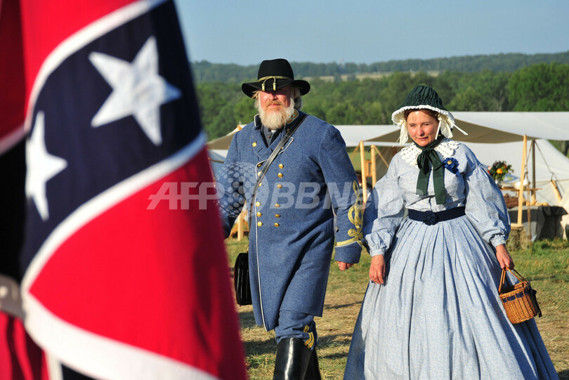 写真は、南軍兵士とその妻に扮(ふん)した参加者ら(2011年7月1日撮影)。(c)AFP/Karen BLEIER