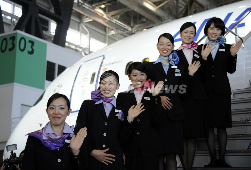 写真は、B787型機のタラップで手を振るANAの客室乗務員ら(2011年7月4日撮影)。(c)AFP/TOSHIFUMI KITAMURA