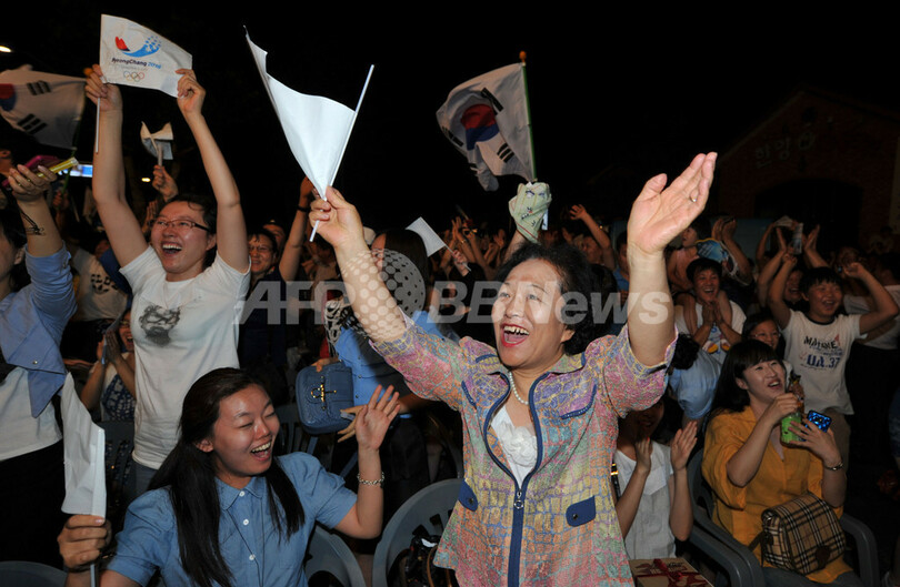 写真は冬季五輪開催決定に喜ぶ人々(2011年7月6日撮影)(c)AFP/KIM JAE-HWAN