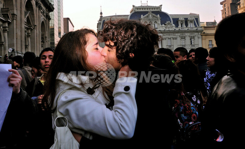熱~いキスで教育制度に抗議、チリの大学生ら