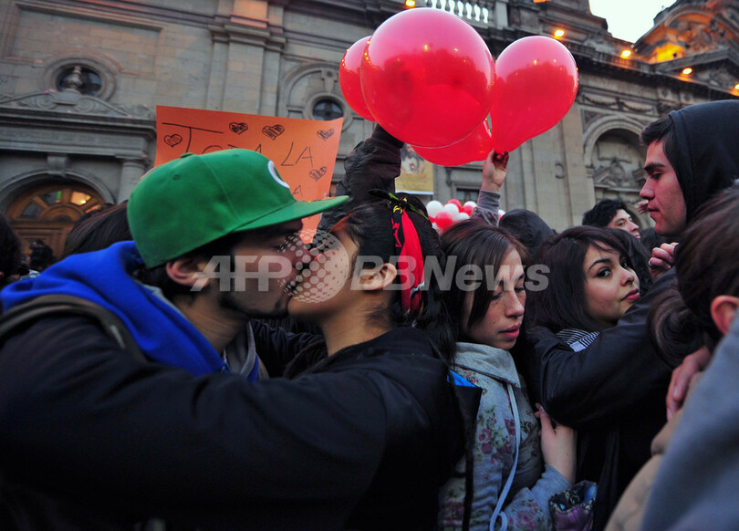 熱~いキスで教育制度に抗議、チリの大学生ら