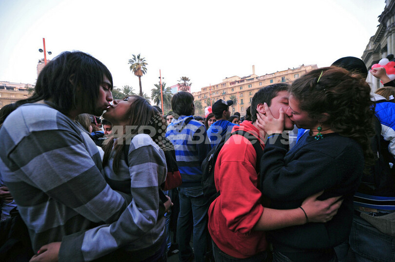 【7月8日 AFP】南米チリの首都サンティアゴ(Santiago)で6日、大学生らが路上でキスを交わすことによって教育制度への不満を示す「キス・パーティー」を行った。セバスティアン・ピニェラ(Sebastian Pinera)大統領はこの前日、教育政策に40億ドル(約3200億円)の追加予算を投入すると発表したが、学生らは国内の各種学校・大学は非営利目的で運営すべきだと主張している。(c)AFP