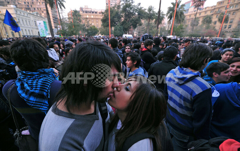 【7月8日 AFP】南米チリの首都サンティアゴ(Santiago)で6日、大学生らが路上でキスを交わすことによって教育制度への不満を示す「キス・パーティー」を行った。セバスティアン・ピニェラ(Sebastian Pinera)大統領はこの前日、教育政策に40億ドル(約3200億円)の追加予算を投入すると発表したが、学生らは国内の各種学校・大学は非営利目的で運営すべきだと主張している。(c)AFP