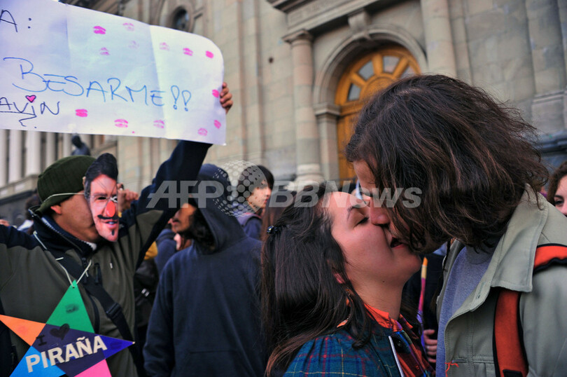 熱~いキスで教育制度に抗議、チリの大学生ら