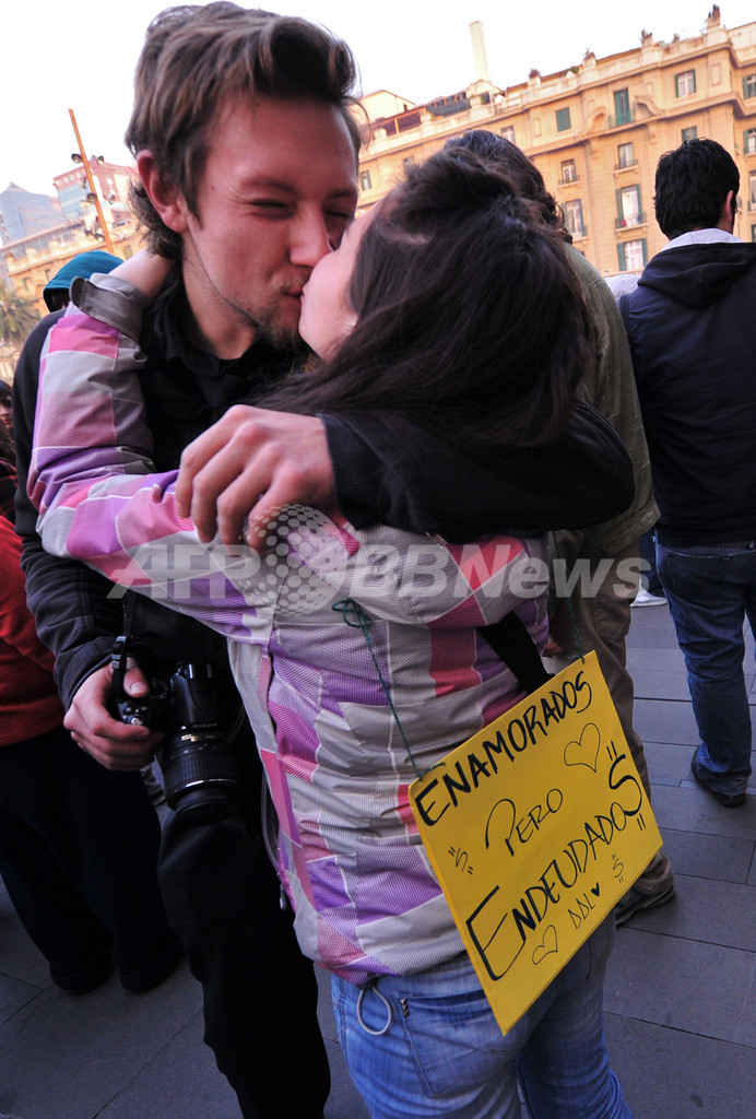 熱~いキスで教育制度に抗議、チリの大学生ら