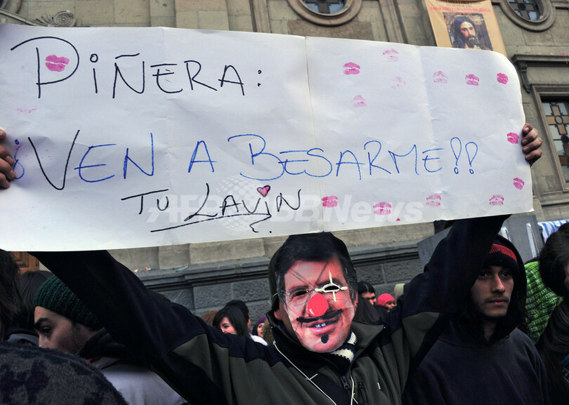 写真は、「ピニェラ(大統領)、ここに来て私にキスを!」と書かれた紙を掲げ「キス・パーティー」に参加する学生(2011年7月6日撮影)。(c)AFP/Martin Bernetti